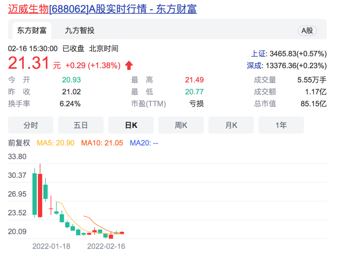 今年1月18日登陆科创板的迈威生物开盘即破发,盘中跌幅超30%。截至当日收盘下跌29.6%报24.50元,而截至2月16日,迈威生物已相比发行价下跌38.76%
