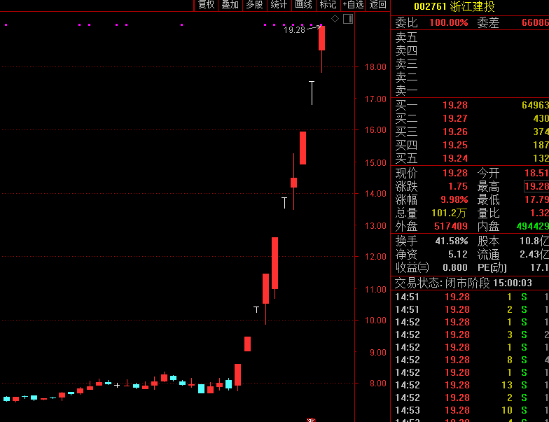 2月18日,浙江建投以涨停价19.28元报收,10个交易日录得9涨停,累计涨幅146%。即使如此,资金追涨情绪依然浓厚,周五公司收盘涨停价上封单近6.5万手。