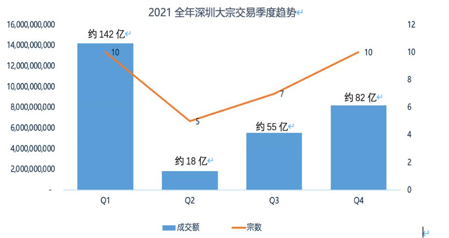 2021年,深圳成交32宗大宗交易,总成交金额约297亿元,总成交额同比下降约6%,但成交宗数显著增加,小规模交易正成为市场主流。