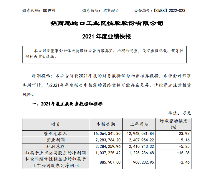 2月23日晚间,招商蛇口(001979)发布业绩快报,2021年公司实现营业总收入1606.43亿元,同比增长23.93%;同期实现归母净利润103.72亿元,同比下滑15.35%。