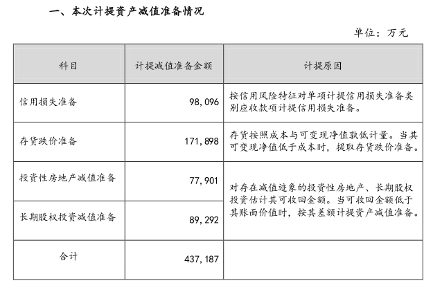 存货跌价准备方面,主要由于部分房地产项目销售价格未达预期。公告显示,报告期末,公司根据市场参考价格,按照存货的预计售价减去至完工时预计将要发生的成本、销售费用以及相关税费后的金额确定可变现净值。当其可变现净值低于成本时,提取存货跌价准备,共计提存货跌价准备17.19亿元。