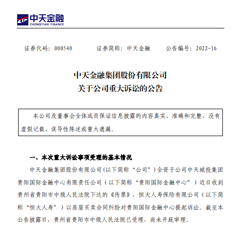 3月3日,中天金融发布公告称,全资子公司中天城投贵阳国际金融中心(下称“中天城投”)近日收到贵阳中院的传票,恒大人寿以房屋买卖合同纠纷对中天城投提起诉讼,要求返还全部交易价款19.16亿元,并支付违约金2.87亿元。