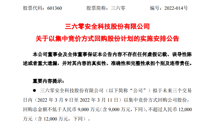 3月8日晚间,三六零(601360)发布回购计划实施安排,拟在未来三个交易日内以集中竞价方式回购公司股份,回购金额不低于9000万元,不超过1.2亿元。