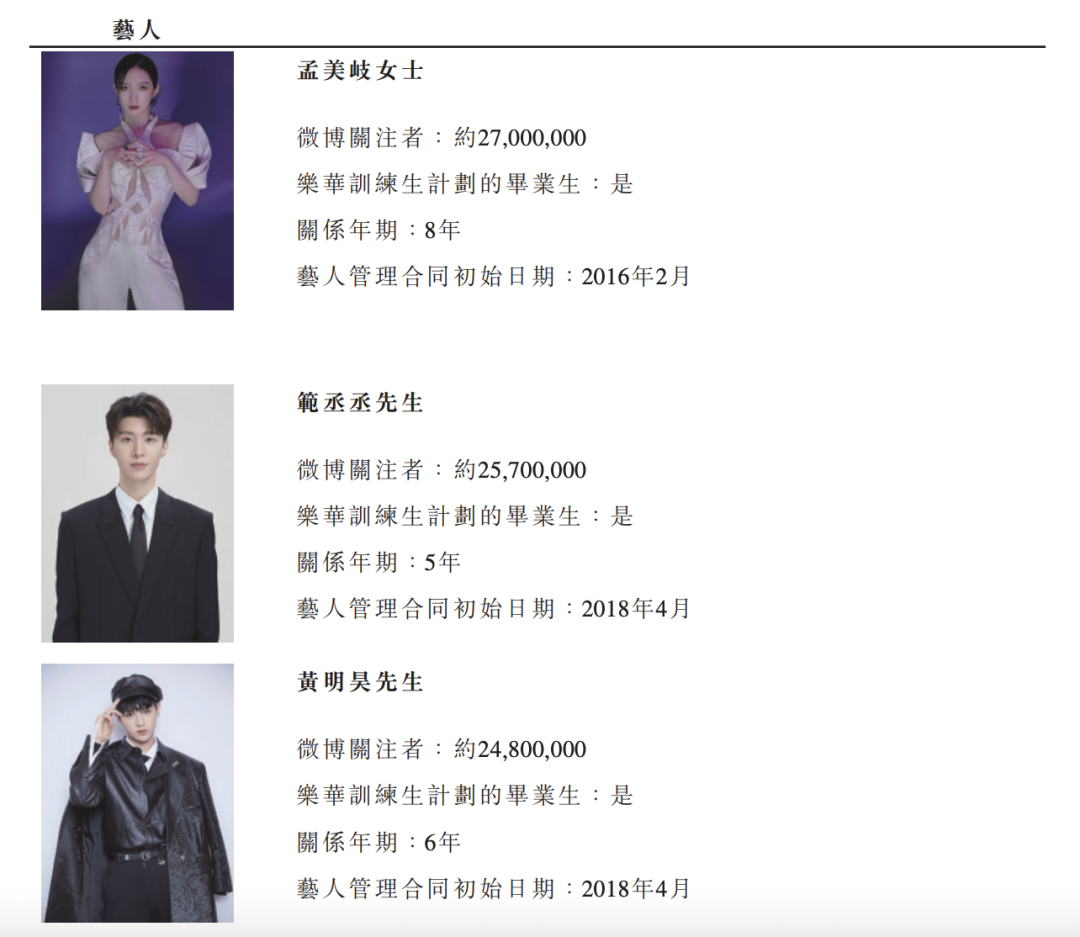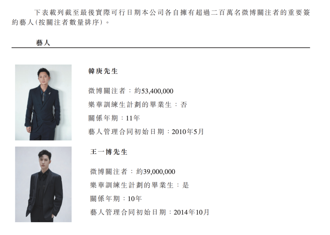 招股书透露,乐华娱乐通常与艺人签订独家艺人管理合同,合同期5到15年不等,通常包括自动续期的条款。而与练习生签订的独家训练生合同一般为期三年。截至2021年12月31日,乐华共有20名商务经纪和19名执行经纪,他们通常各自同时与1到3名艺人合作。