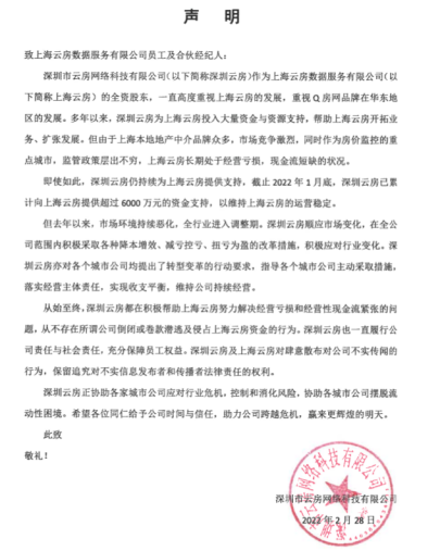 深圳云房称,截至2022年1月底,已累计向上海云房提供超过6000万元资金支持。但去年以来,市场环境持续恶化,全行业进入调整期,为顺应市场变化,全公司积极采取了降本增效、扭亏为盈的改革措施,维持公司持续经营。