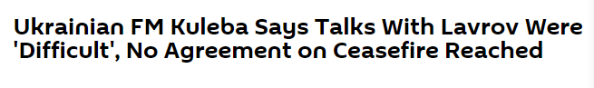 俄罗斯卫星网10日消息,乌克兰外长库列巴称与拉夫罗夫的会谈进展“困难”,双方没有达成停火协议。