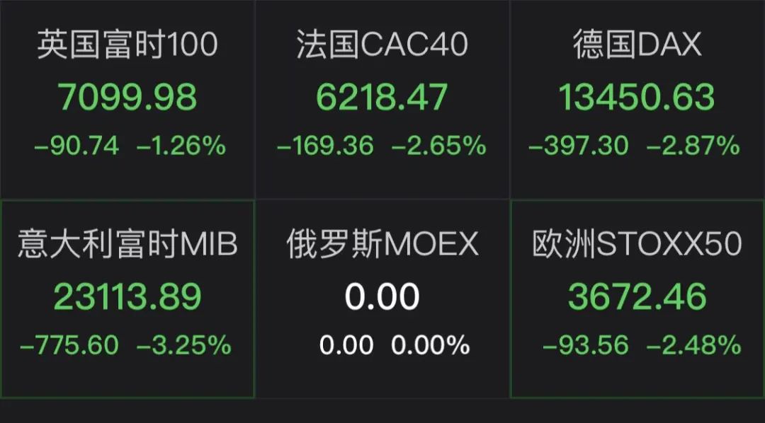 截至发稿,英法德三大指数均出现重挫,其中,德国DAX指数跌幅逼近3%。