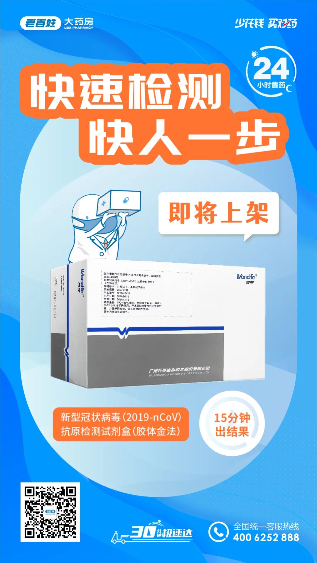 e公司记者从老百姓(603883)了解到,12日,老百姓大药房与广州万孚生物达成合作,第一批新冠抗原快测产品已在门店配送中,预计近日就将在门店上架销售。首批产品将登陆老百姓大药房包含上海、湖南、江苏在内的12个省市门店。