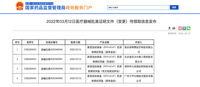 此前,e公司曾报道,国家药监局网站3月12日发布的医疗器械批准文件(变更)待领取信息显示,由万孚生物、华大基因子公司深圳华大因源医药科技有限公司、北京金沃夫生物工程科技有限公司、南京诺唯赞医疗科技有限公司、北京华科泰生物技术股份有限公司5家公司研发的5款新冠抗原检测试剂盒通过了药监局的注册信息变更。