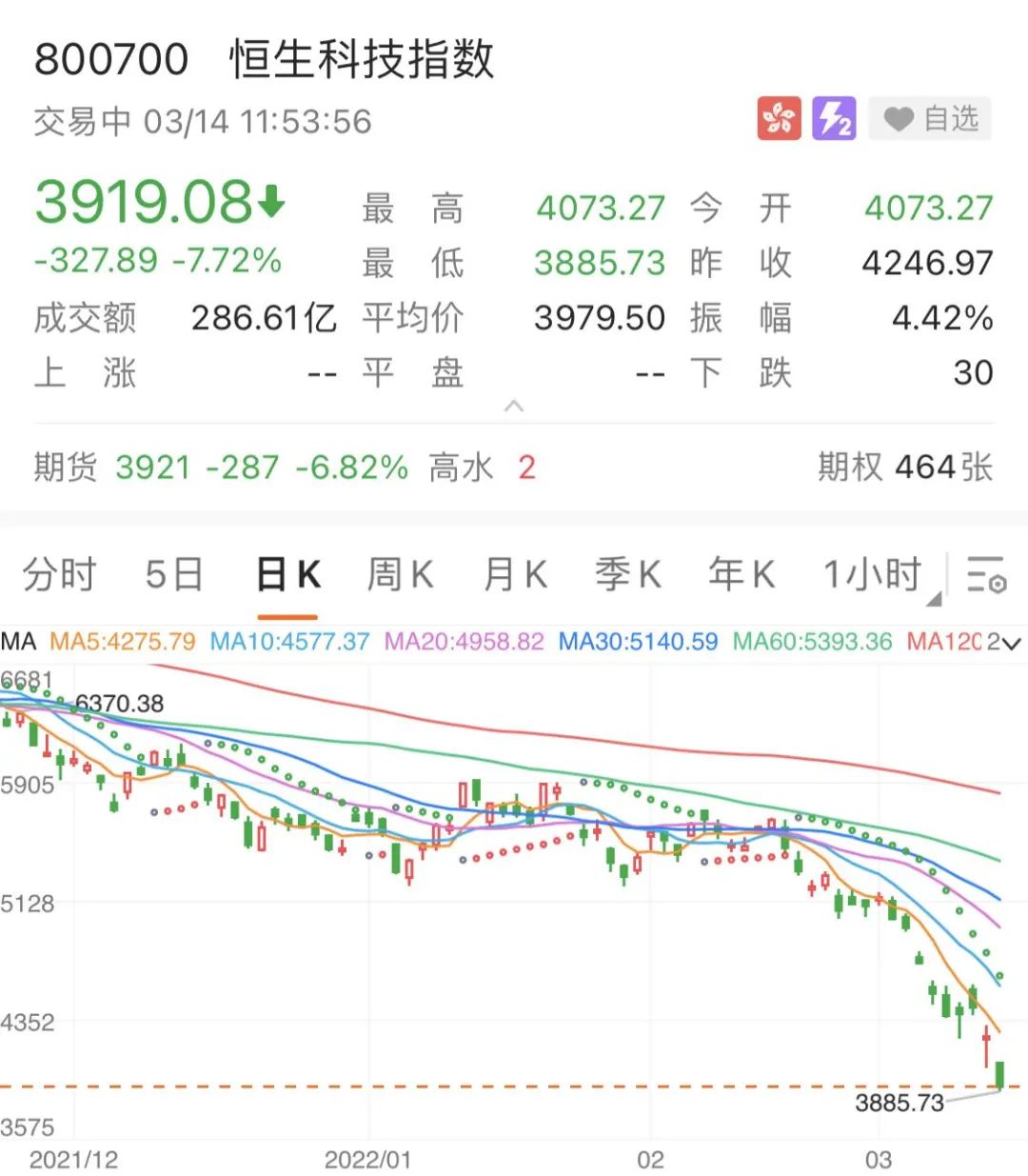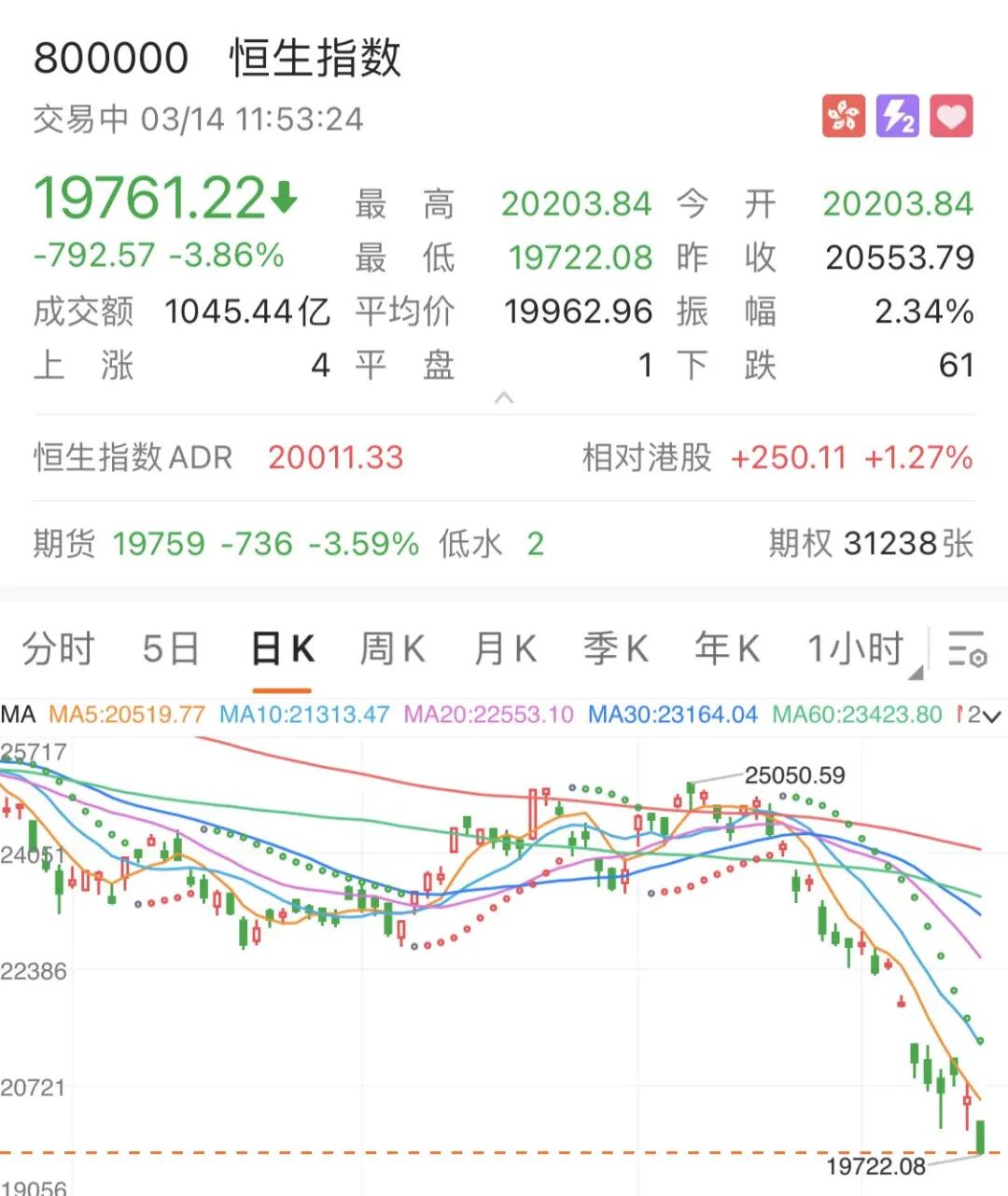 港股市场今日大幅低开低走,恒生指数跌近4%,击穿20000点整数关口,创近6年来新低;恒生科技指数更是暴跌8%,跌破4000点整数关,亦创多年新低。万国数据跌逾25%,创历史新低,小鹏汽车、百度集团、京东集团、美团逾10只科技股跌幅超10%,阿里巴巴亦再度重仓逾7%并继续创历史新低,腾讯控股、网易、小米集团等也全线尽墨。