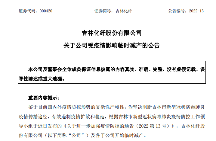在此之前,吉林化纤3月12日公告,因近期吉林市新型冠状病毒肺炎疫情形势严峻,按照政府疫情防控的要求,人员流动受限,导致劳动用工不足,经公司疫情防控工作领导小组研究决定,于2022年3月11日起采取临时减产措施。本次临时减产将对公司2022年第一季度经营业绩产生一定的不利影响,具体影响程度以2022年一季度财务报告为准。