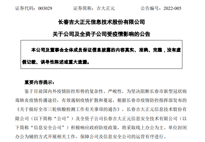 吉大正元称,公司作为信息技术服务企业,日常运营中主要根据客户需求向客户提供产品及服务,本次长春疫情管控措施可能导致公司 2022 年一季度部分订单执行延后。对于因疫情延期的项目,公司将积极在后续期间妥善执行,保障项目顺利实施。上述事项可能会对公司 2022 年第一季度经营业绩产生一定影响,具体影响程度以公司 2022 年一季度财务报告为准。