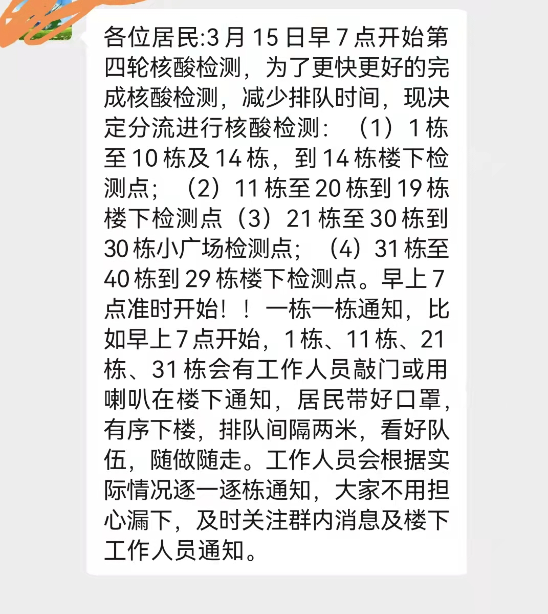 3月14日晚,陆续有长春市民接到将于3月15日进行第四轮核酸检测的通知。