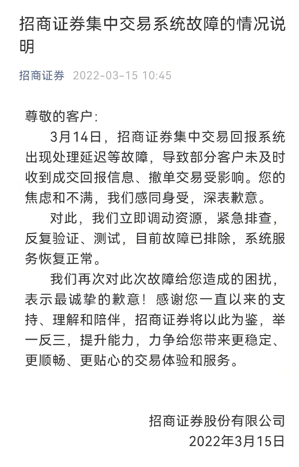 对此,招商证券午间收盘后作出正式回应,第一是针对客户反馈的“无法成交”,公司称,集中交易系统所有交易委托都已实时传送至交易所系统,但是由于成交回报处理延迟,部分客户在客户端未及时收到成交回报信息。招商证券相关负责人进一步解释称,因系统故障影响了成交回报的报送,但并没有影响成交。第二是关于撤单,公司表示,撤单交易确实受到影响,“给客户带来的不便,公司深感抱歉。目前公司正在加紧修复,问题已经有所缓解,系统其他功能正常”。