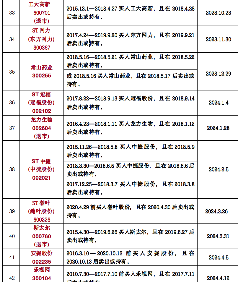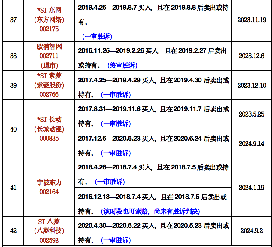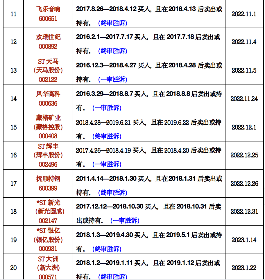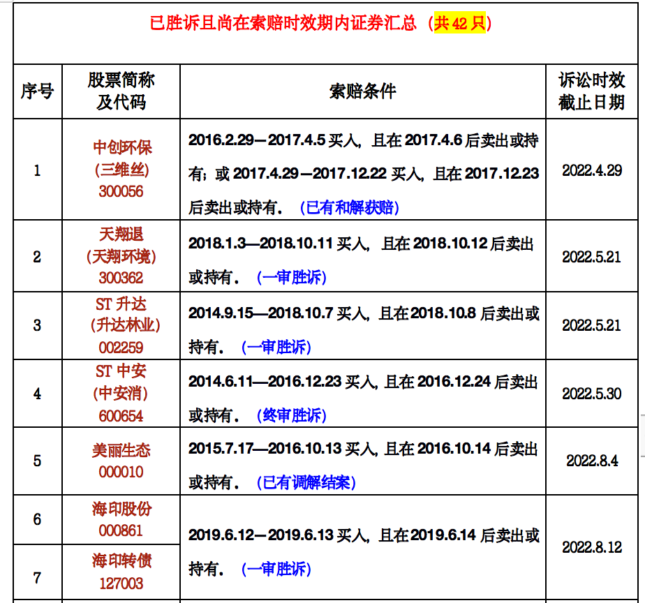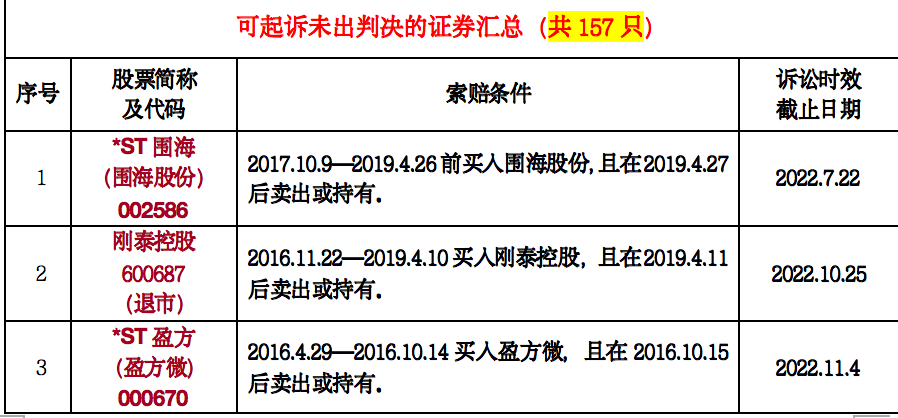 “经我们团队不完全统计,目前因违规或者涉嫌违规,投资者有权提起虚假陈述可索赔证券约199只。大致可以分为已胜诉且尚在索赔有效期、可起诉但未出判决这两大类,分别涉及42只和157只股票或债券。”北京时择律师事务所臧小丽律师告诉证券时报.e公司记者。