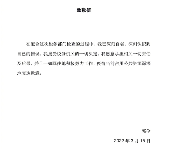 随后,邓伦通过个人微博发布致歉信称,已深刻认识到自己的错误,并接受税务机关的一切决定,愿意承担一切责任及后果。