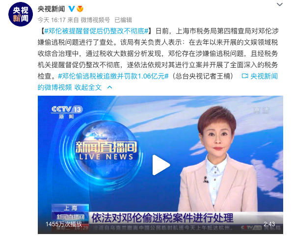 3月15日,央视新闻发布消息称,明星邓伦因偷逃个人所得税4765.82万元,其他少缴个人所得税1399.32万元。上海市税务局第四稽查局对邓伦依法追缴税款、加收滞纳金并处罚款共计1.06亿元。