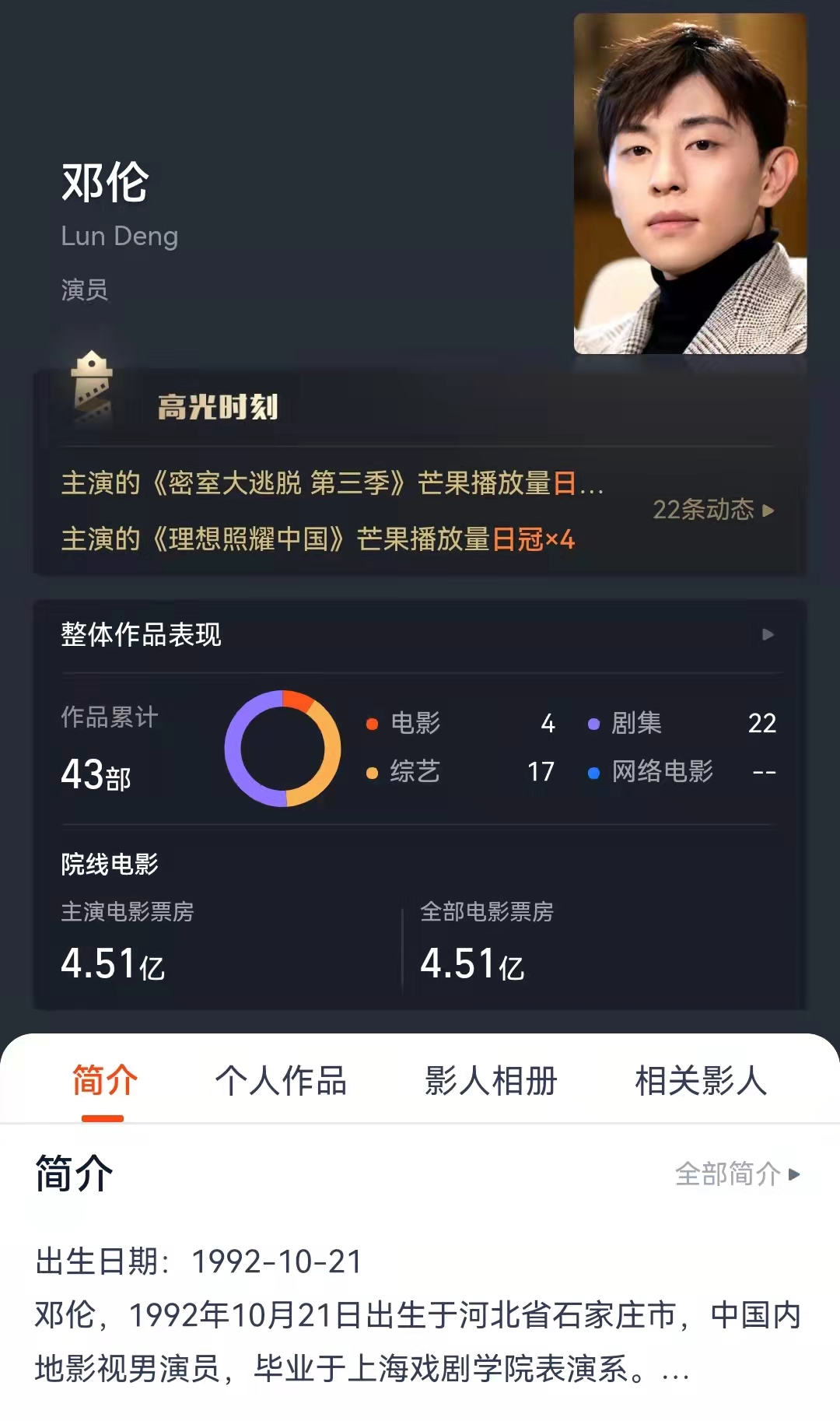 资料显示,邓伦1992年10月出生于河北省石家庄市,毕业于上海戏剧学院表演系。几年前,在与前公司经纪合约期满后,邓伦成立了自己的工作室,开始独立发展。