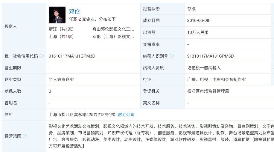 其中,邓伦(上海)影视文化工作室成立于2016年6月,其经营范围涉及影视文化艺术活动交流策划,影视文化领域内的技术开发、技术服务、技术咨询,影视剧策划及咨询等。