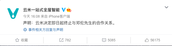在邓伦偷逃税消息公布后,3月15日下午,云米品牌火速发布公告,与邓伦终止合作关系,这距离其官宣邓伦为全球品牌代言人仅过去约2小时。