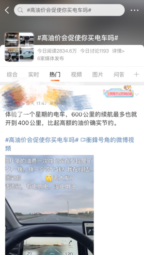 原油价格的大涨,引发了消费者对于新能源汽车的兴趣和关注。微博上,主题为“高油价会促使你买电动车吗”的话题甚至一度登上了热搜榜。
