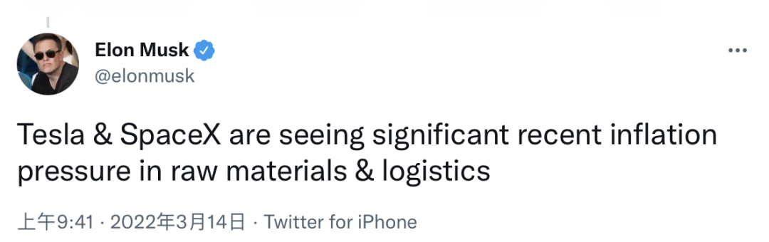 3月14日,特斯拉首席执行官埃隆·马斯克发文称,特斯拉以及旗下的火箭公司SpaceX正面临原材料和物流方面的巨大通胀压力。