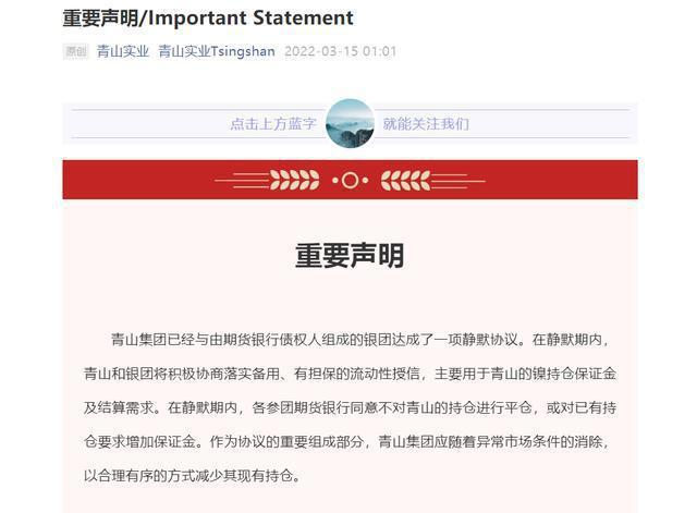 3月15日,账号主体为上海青山贸易有限公司的微信公众号“青山实业Tsingshan”发布的《重要声明》显示,青山控股已经与由期货银行债权人组成的银团达成了一项静默协议,同意不对持仓进行平仓或对已有持仓要求增加保证金。