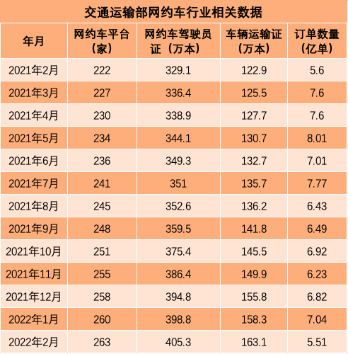 ●据全国网约车监管信息交互平台统计,截至2022年2月28日,全国共有263家网约车平台公司取得经营许可,较2021年同期新增41家,较2021年7月新增22家。