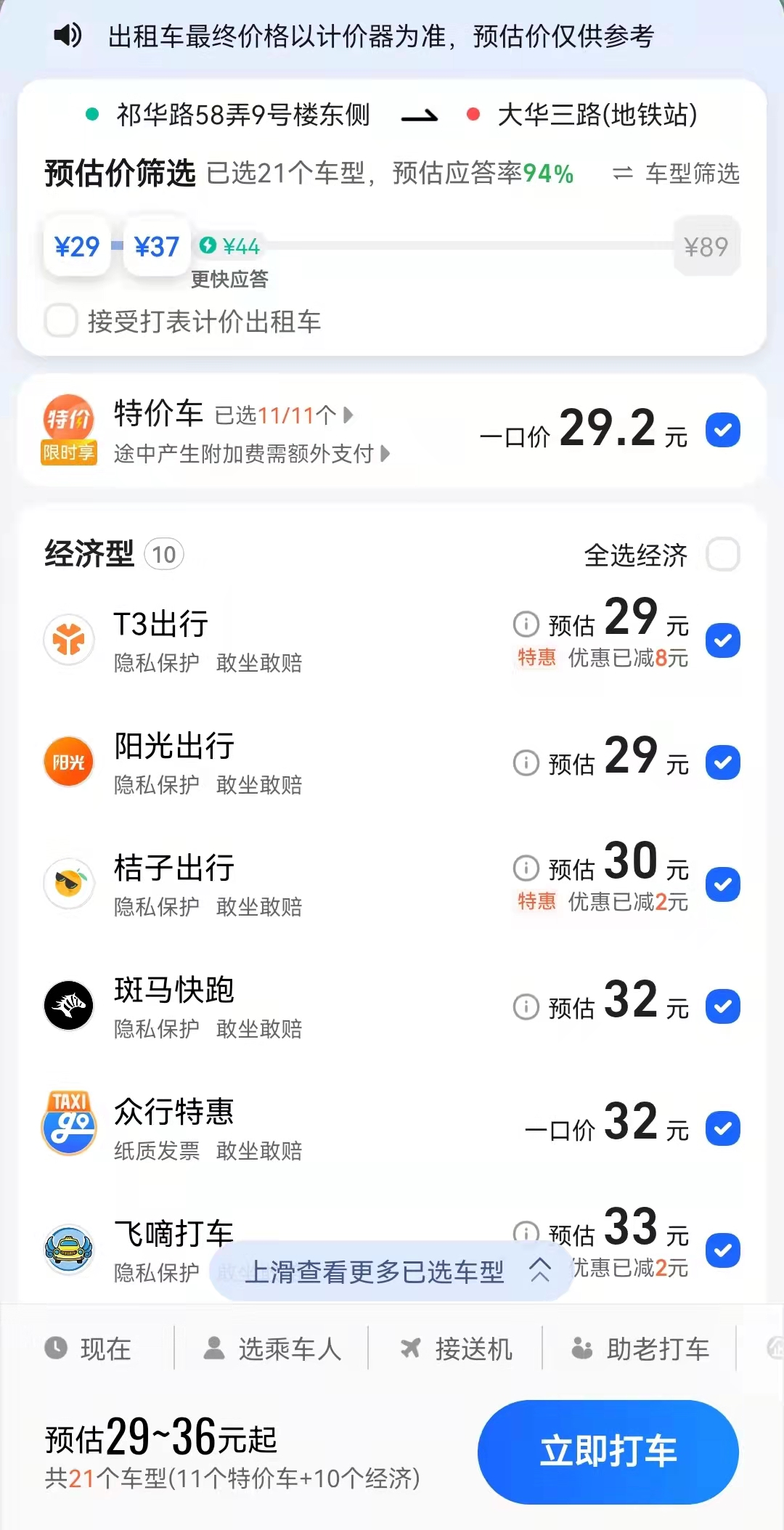 证券时报·e公司记者注意到,目前在美团APP、百度地图APP中,聚合了阳光出行、首汽畅享、飞嘀打车等平台的网约车。而高德地图聚合的打车平台更多,其经济型专车就有T3出行、桔子出行、神州专车、曹操出行等十多个平台可供用户挑选。
