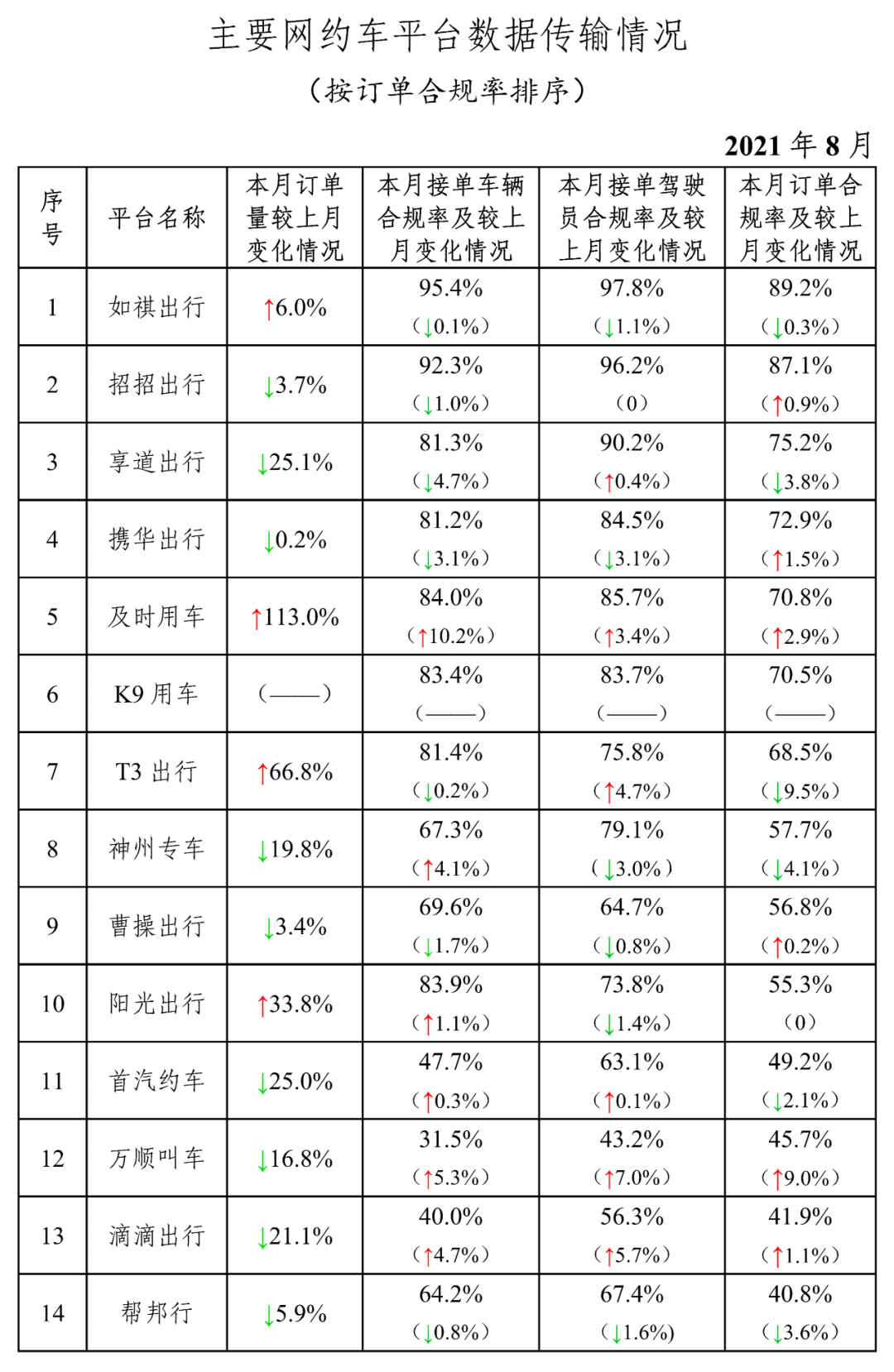除了订单量下滑,滴滴还面临着车辆及驾驶员合规率的问题。在交通运输部公布的数据中,滴滴平台订单合规率(指驾驶员和车辆均获得许可的订单量占比)持续排名垫底。