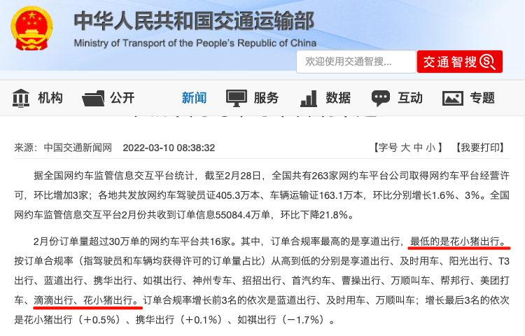 如2022年2月,订单量超过30万单的网约车平台共16个,其中,滴滴出行的订单合规率仅有46.9%,滴滴旗下花小猪出行的合规率更是低至32.1%。在16个网约车平台中,滴滴及花小猪是仅有的两个订单合规率不足50%的平台。