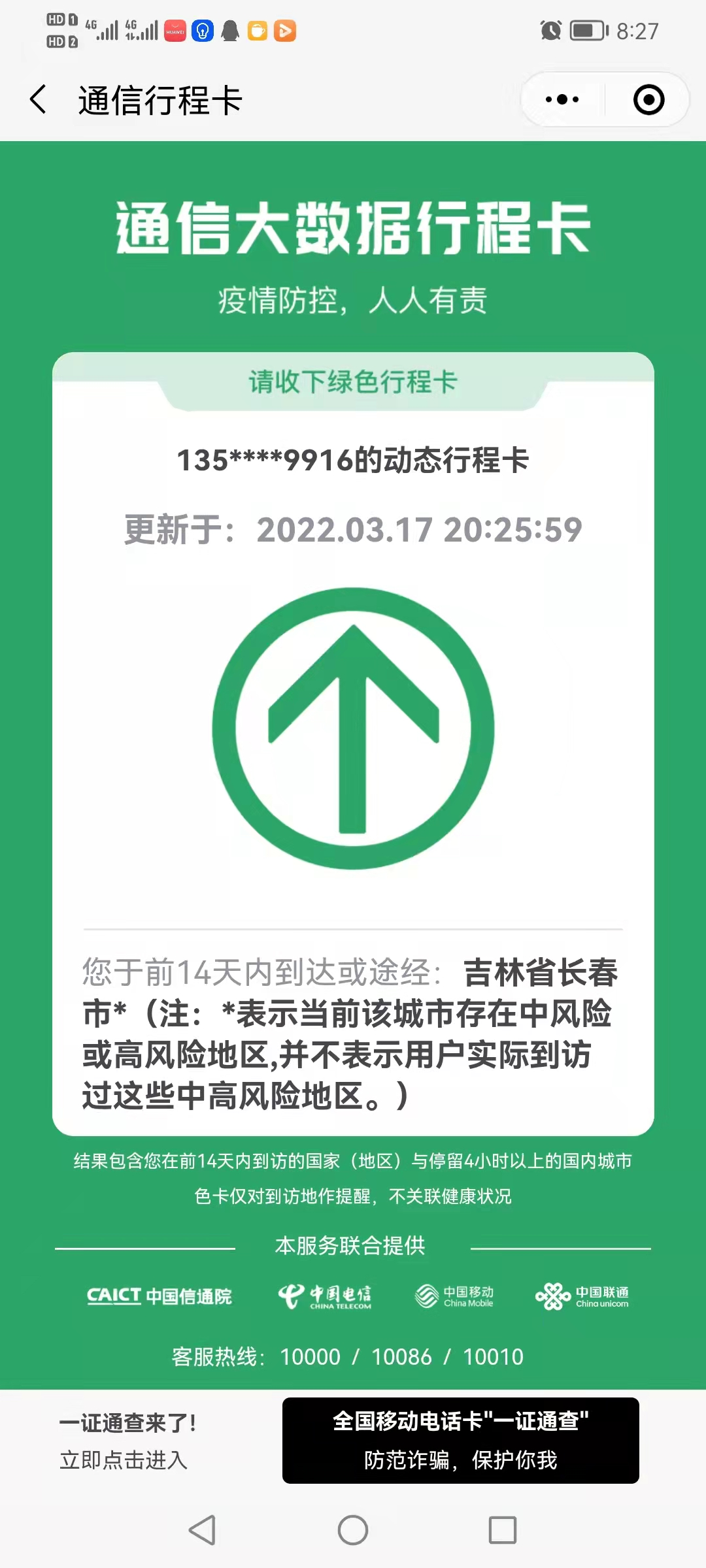 按照小程序上给出的说法,我们于前14天内到达或途经吉林省长春市。通信大数据行程卡戴星,说明目前长春市存在中风险或高风险地区,但是并不代表我们实际到访过这些中高风险地区。