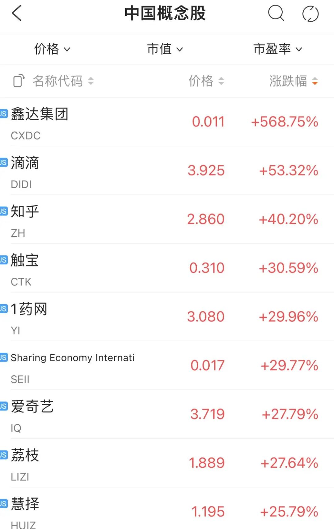 其中,纳斯达克金龙指数涨近9%,滴滴涨超50%,爱奇艺涨超27%,知乎涨40%,荔枝网涨27%,趣头条涨13%,拼多多涨12%,小鹏汽车、B站、微博也至少涨超10%,达达、理想汽车涨、贝壳、叮咚买菜、网易有道、蔚来汽车、京东至少涨超6%,百度涨超5%。