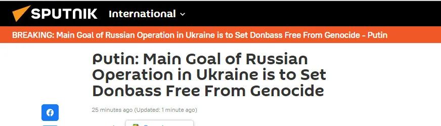 俄罗斯卫星通讯社18日刚刚消息称,俄总统普京表示,顿巴斯地区遭受种族灭绝,俄罗斯发起军事行动的目的是避免这一情况。