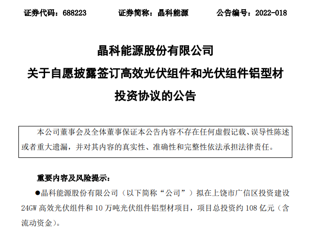 根据晶科能源公告,公司与上饶市广信区人民政府于3月18日签订投资协议,晶科能源拟在上饶市广信区投建 24GW 高效光伏组件和10万吨光伏组件铝型材项目,项目总投资约108亿元。