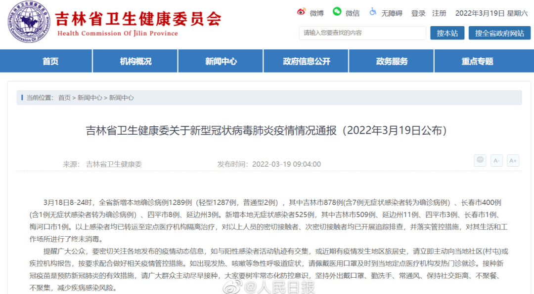 3月18日8-24时,全省新增本地确诊病例1289例(轻型1287例,普通型2例),其中吉林市878例(含7例无症状感染者转为确诊病例)、长春市400例(含1例无症状感染者转为确诊病例)、四平市8例、延边州3例。新增本地无症状感染者525例,其中吉林市509例、延边州11例、四平市3例、长春市1例、梅河口市1例。以上感染者均已转运至定点医疗机构隔离治疗,对以上人员的密切接触者、次密切接触者均已开展追踪排查,并落实管控措施,对其生活和工作场所进行了终末消毒。