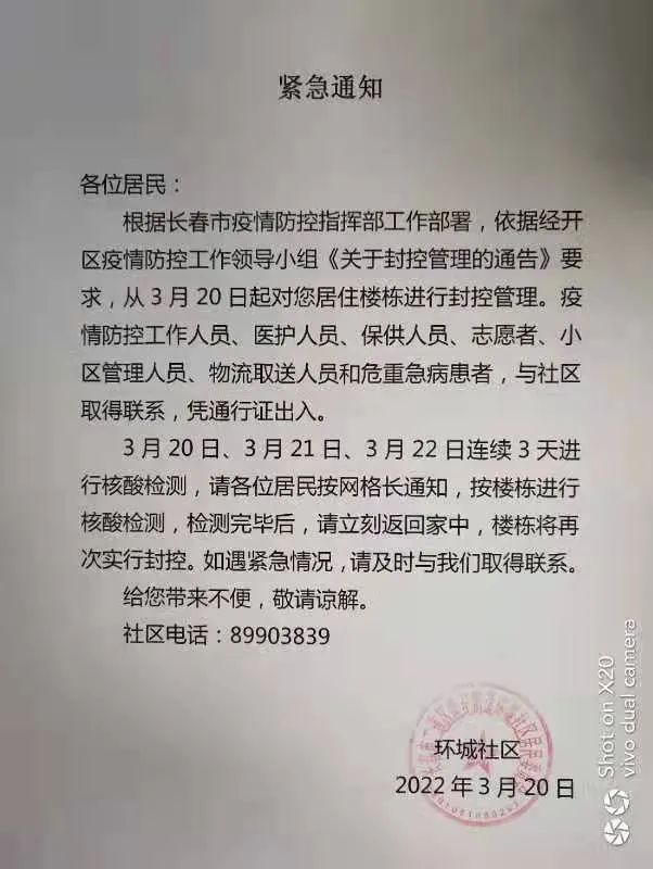 就在21日凌晨2时40分,我居住小区的物业公司在业主微信群中发来消息:根据经开区疫控管理领导小组办公室《关于疫情管理的通知》要求,2022年3月21日至22日全市进入"静止状态",除疫控正式人员外(不含志愿者和非正式疫控单位人员),所有人员均在小区静默,有极特情况的必须向社区报备。为了确保咱们小区不出现疫情,人员只出不进。除上述人员以外,其他人不准下楼,给大家带来麻烦,敬请谅解!