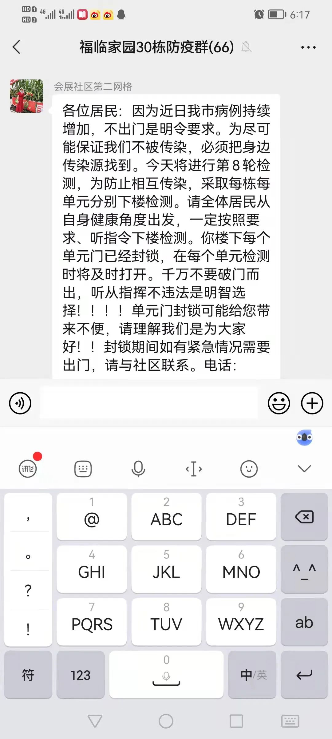 之后,社区工作人员又于6时22分发布消息称:因为近日我市病例持续增加,不出门是明令要求。为尽可能保证我们不被传染,必须把身边传染源找到。今天将进行第8轮检测,为防止相互传染,采取每栋每单元分别下楼检测。请全体居民从自身健康角度出发,一定按照要求、听指令下楼检测。你楼下每个单元门已经封锁,在每个单元检测时将及时打开。千万不要破门而出,听从指挥不违法是明智选择!!!!单元门封锁可能给您带来不便,请理解我们是为大家好!!封锁期间如有紧急情况需要出门,请与社区联系。