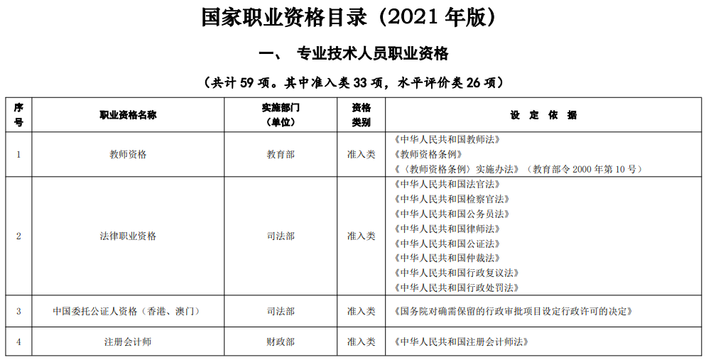 在人社部发布的国家职业资格目录(2021年版)中,技能人员职业资格共有13项,如焊工、保安员、消防员等。专业技术人员职业资格共有59项,其中准入类33项,如教师资格、法律职业资格、注册会计师等;水平评价类26项,如税务师、精算师、证券期货基金从业人员资格等。