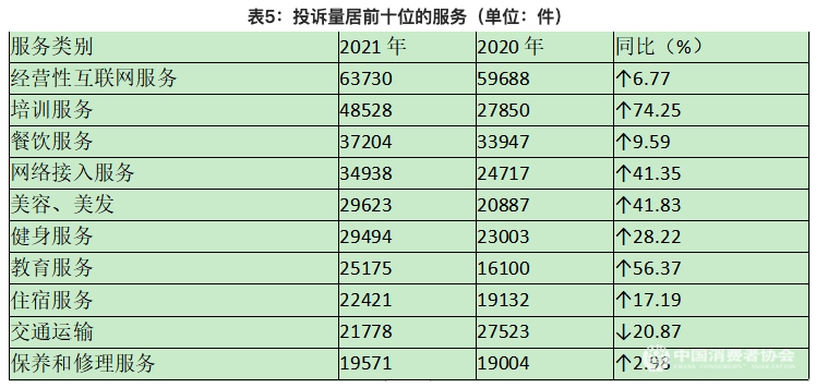 以2021年为例,中消协公布的数据显示,该年度,在具体服务投诉中,培训服务的投诉量为4.85万件,同比增长74.3%。其投诉量仅次于经营性互联网服务,高居第二。