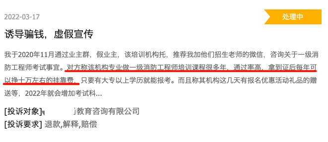 中消协表示,一些机构对不符合职业资格考试条件的参训人员,伪造报名资质,承诺保过,事后又以各种借口拒不担责,是教育培训领域被投诉的主要问题之一。中消协提醒,消费者在选择培训机构时,不应轻信包报名、包拿证等宣传。