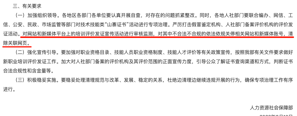 一直以来,职业资格证书培训机构,大多通过新媒体平台进行宣传。此次发布的通知也提到,将对网站和新媒体平台上的培训评价发证宣传活动进行审核监测,对其中不合法不合规的依法依规关停相关网站和新媒体账号,清除关联网页。