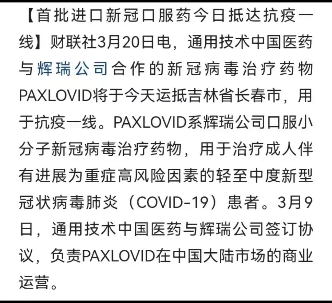 据中国医药的官微,19日下午,中国医药收到国务院应对新型冠状病毒肺炎疫情联防联控机制(医疗物资保障组)和吉林省工信厅相关函件,需紧急调运一批新冠肺炎治疗药物支援地方抗疫。20日清晨5点多,满载着新冠病毒治疗药物Paxlovid的运输专车从中国医药大兴物流中心出发,驶向吉林省长春市,这标志着中国医药新冠治疗药物支援抗疫的药品保障行动全面开启。该批药物预计当天抵达吉林长春,药物到达后将立即送往抗疫前线。