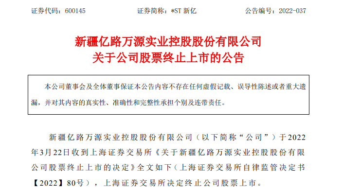 *ST新亿(600145)3月22日晚间公告称,因公司存在2018年度和2019年度虚增营业收入等情况,导致2018年-2020年财务指标实际已触及相关退市规定,上交所决定终止公司股票上市。公司股票将于3月30日起进入退市整理期。