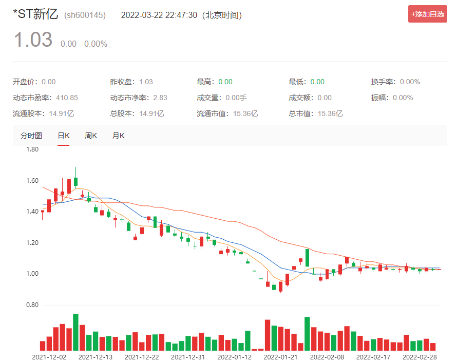 二级市场方面,*ST新亿自3月3日开始停牌,最新收报1.03元。