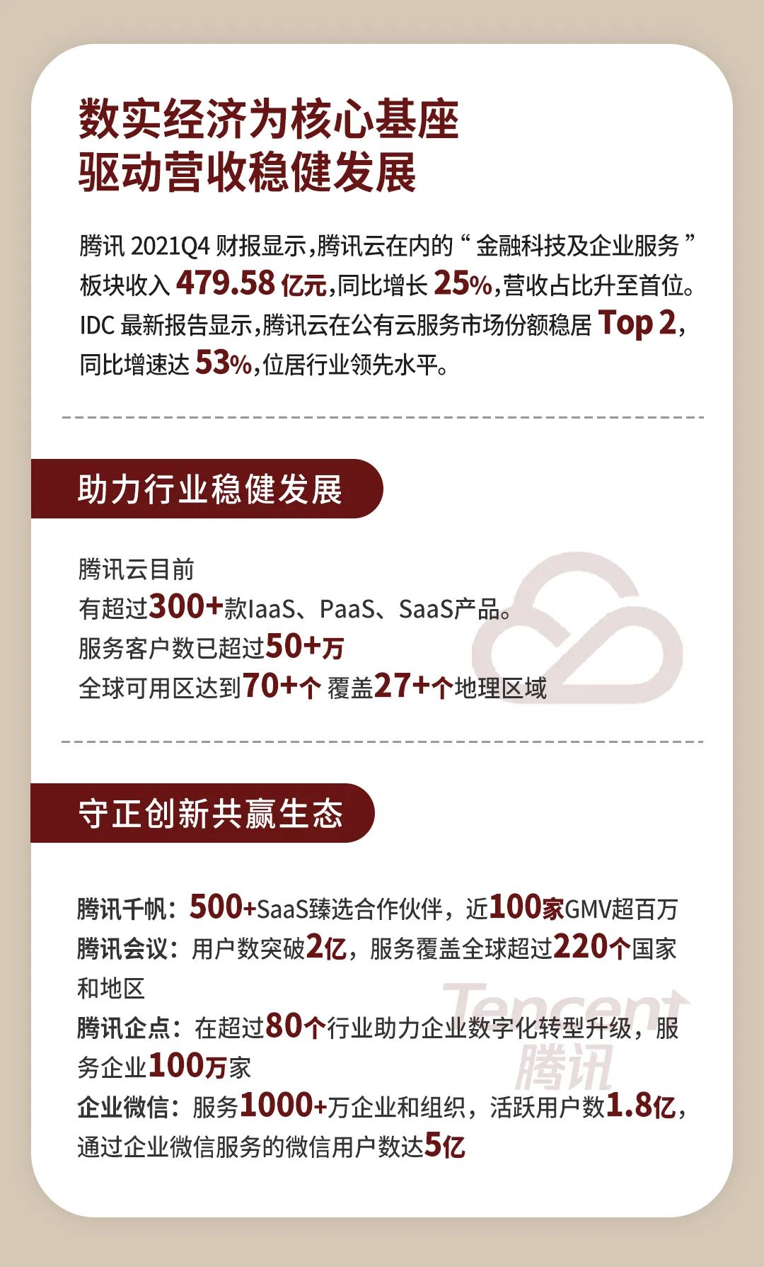 2021年,腾讯明确把“助力实体经济”作为腾讯新的品牌主张,马化腾也表示,“数实融合”要“兴实业、做实事、靠实干”。腾讯正在广泛释放服务用户的能力,以科技实力为各行各业提能增效,助力实体经济中的个体和小微,加速融入实体经济,实现公司“向实”增长的转型。