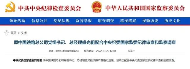 原中国铁路总公司党组书记、总经理盛光祖涉嫌严重违纪违法,目前正配合中央纪委国家监委纪律审查和监察调查。