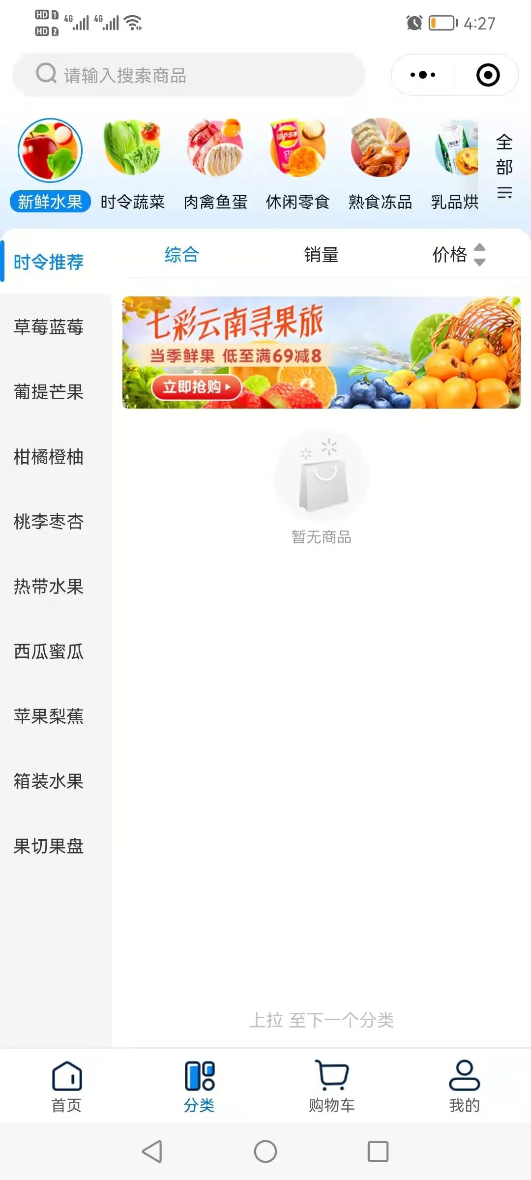 在沃尔玛的小程序上,当我选择点击新鲜水果和时令蔬菜的图标时,均显示暂无商品。
