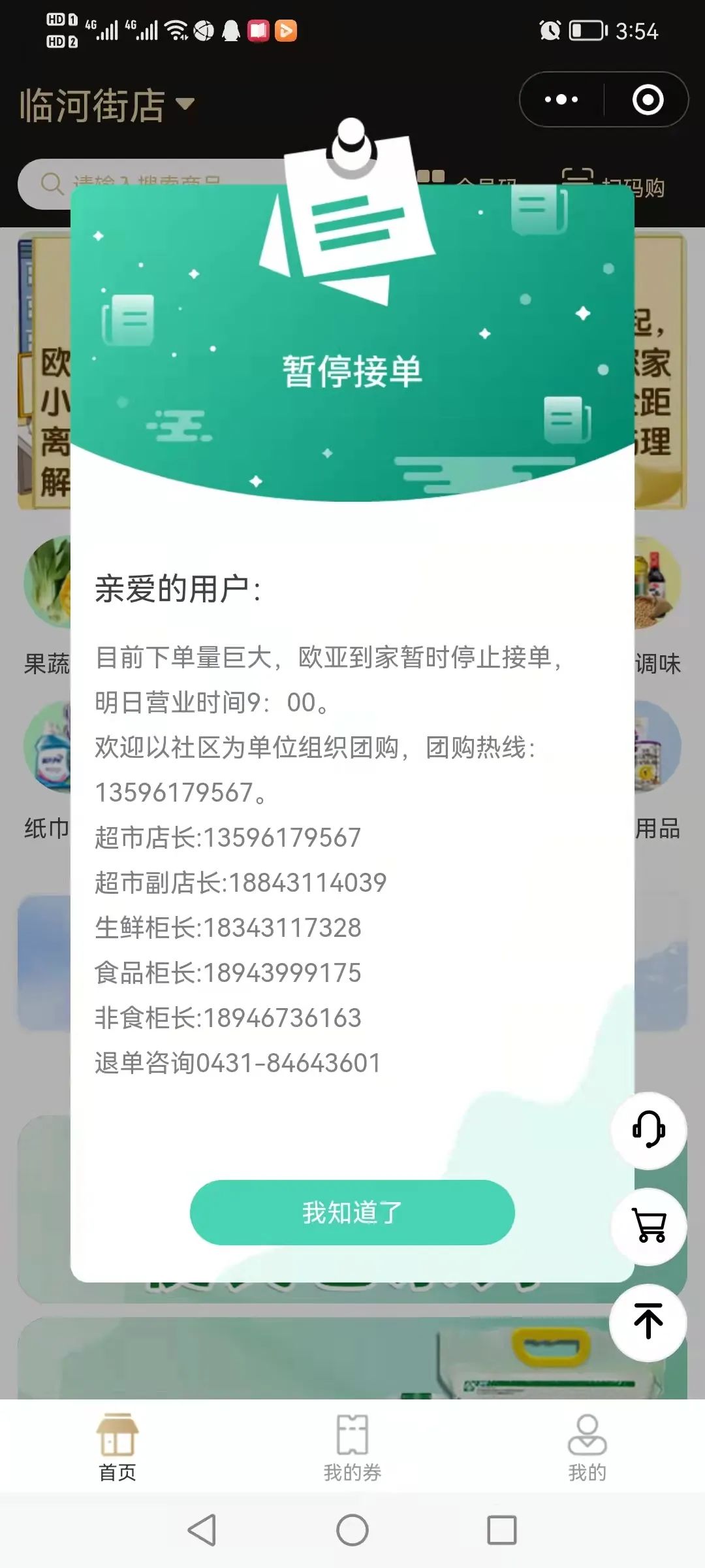 我曾经在3月19日晚、3月20日上午,先后通过欧亚集团旗下的欧亚到家线上配送系统下单,从附近的两家欧亚超市采购生活必需品。3月20日下午,我收到了3月20日上午采购的物品。由于连续两天,我没有收到3月19日晚下单欲购买的商品,所以只能取消订单。令我没有想到的是,之后再想下单时,系统提示:“目前下单量巨大,欧亚到家暂时停止接单。”