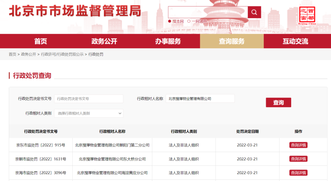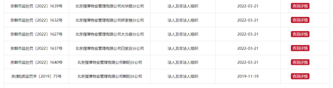 券商中国记者从北京市市场监管局网站了解到,近日,北京搜厚物业管理有限公司(简称SOHO物业)朝阳门第二分公司、东大桥分公司、海淀黄庄分公司、前门分公司、三里屯分公司、望京分公司等15家分公司,被北京市多区市场监督管理局处罚警告并罚款。